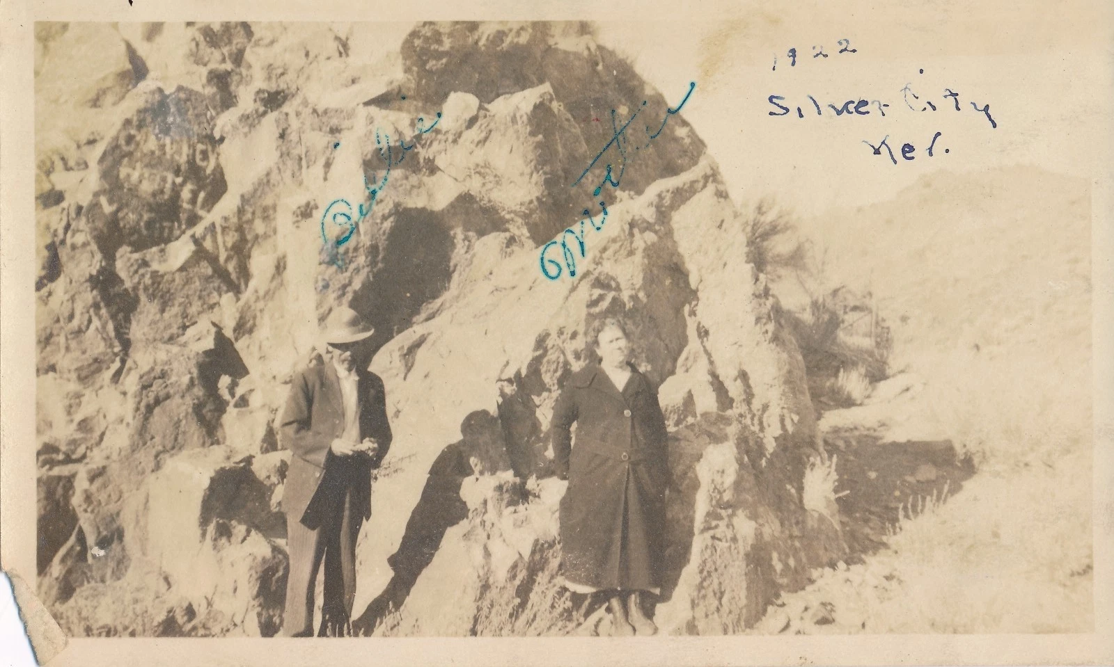 1922 Photo of Ma & Pa Standing Next To Rocks With Hotel On it Siver City Nevada