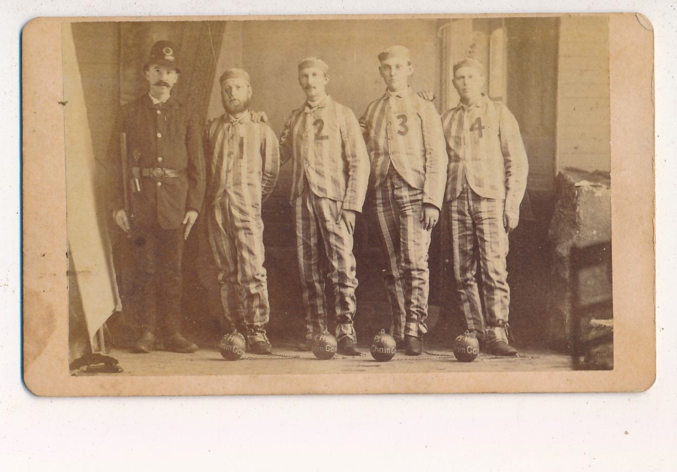 The album also includes a CDV of Nellie Keeler, P.T. Barnum’s 11 Year Old Little Person and a CDV of four prisoners with Ball and Chains made by Pt. Huron Ball & Chain Company. One musician that is holding a trumpet I have never seen before and one secret society member in uniform.